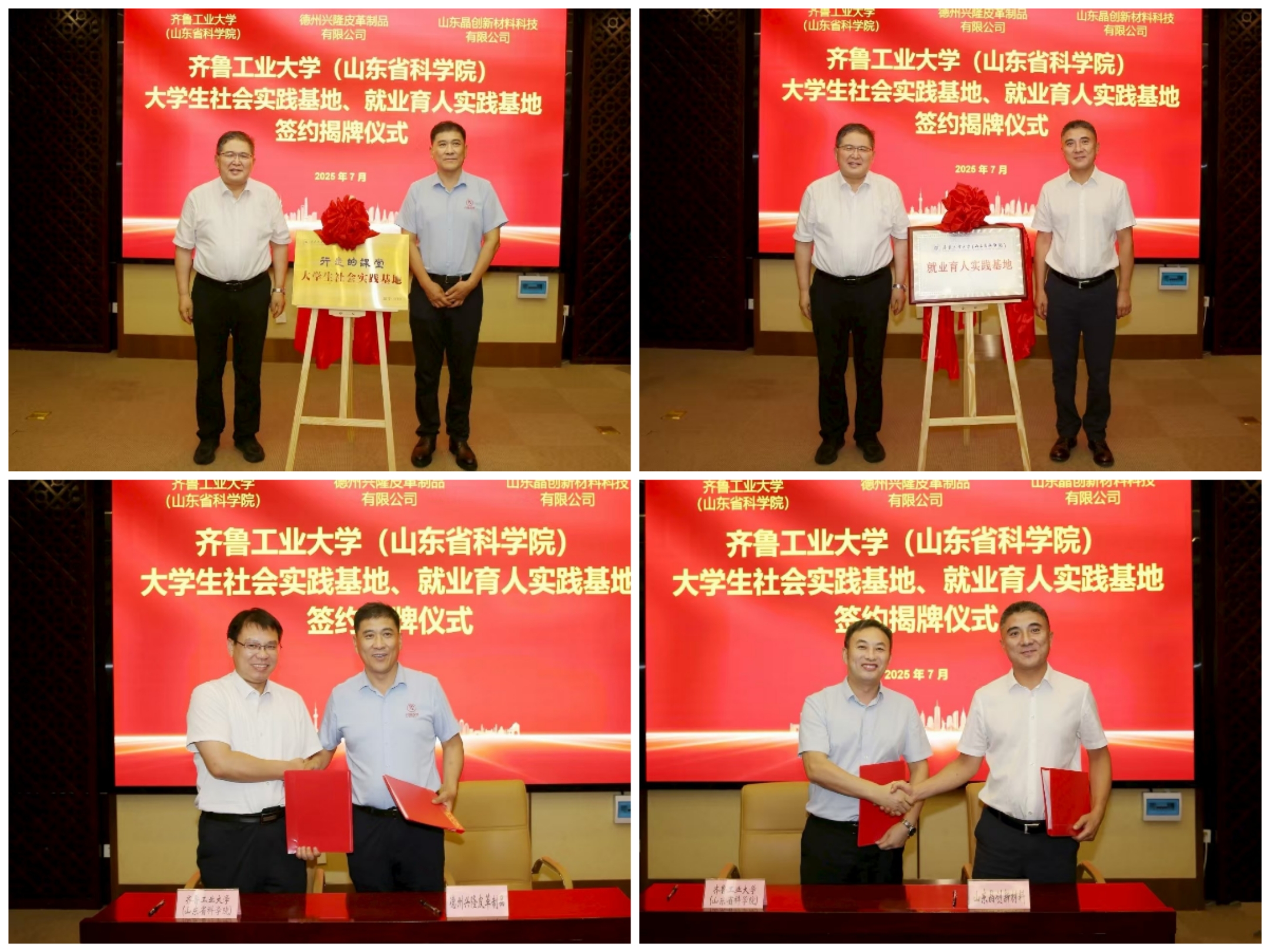 考察伊始,吳衍濤一行首先受到德州市陵城區(qū)區(qū)委、區(qū)政府的熱情接待。會場現(xiàn)場,吳衍濤與德州興隆皮革制品有限公司董事長馮忠河、山東晶創(chuàng)新材料科技有限公司董事長馮忠超共同為大學生社會實踐基地、就業(yè)育人實踐基地揭牌。雙方并分別簽訂了《齊魯工業(yè)大學(山東省科學院)“行走的課堂”大學生社會實踐活動基地協(xié)議書》和《齊魯工業(yè)大學(山東省科學院)就業(yè)育人實踐基地合作協(xié)議》。這不僅是齊魯工業(yè)大學(山東省科學院)與興隆皮革和晶創(chuàng)新材料深化合作的里程碑,更是校企踐行“人才強省”戰(zhàn)略的具體行動—以基地為支點,讓高校智慧扎根產(chǎn)業(yè)土壤,讓青年人才在實踐中綻放光彩。